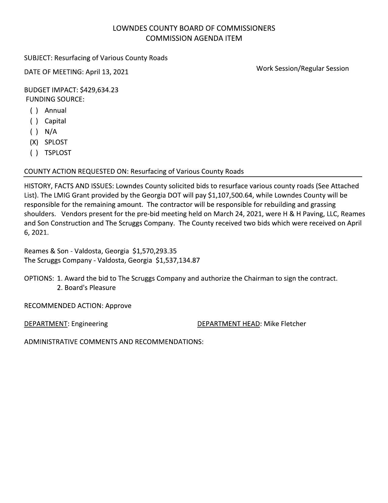COMMISSION AGENDA ITEM: Resurfacing of Various County Roads
