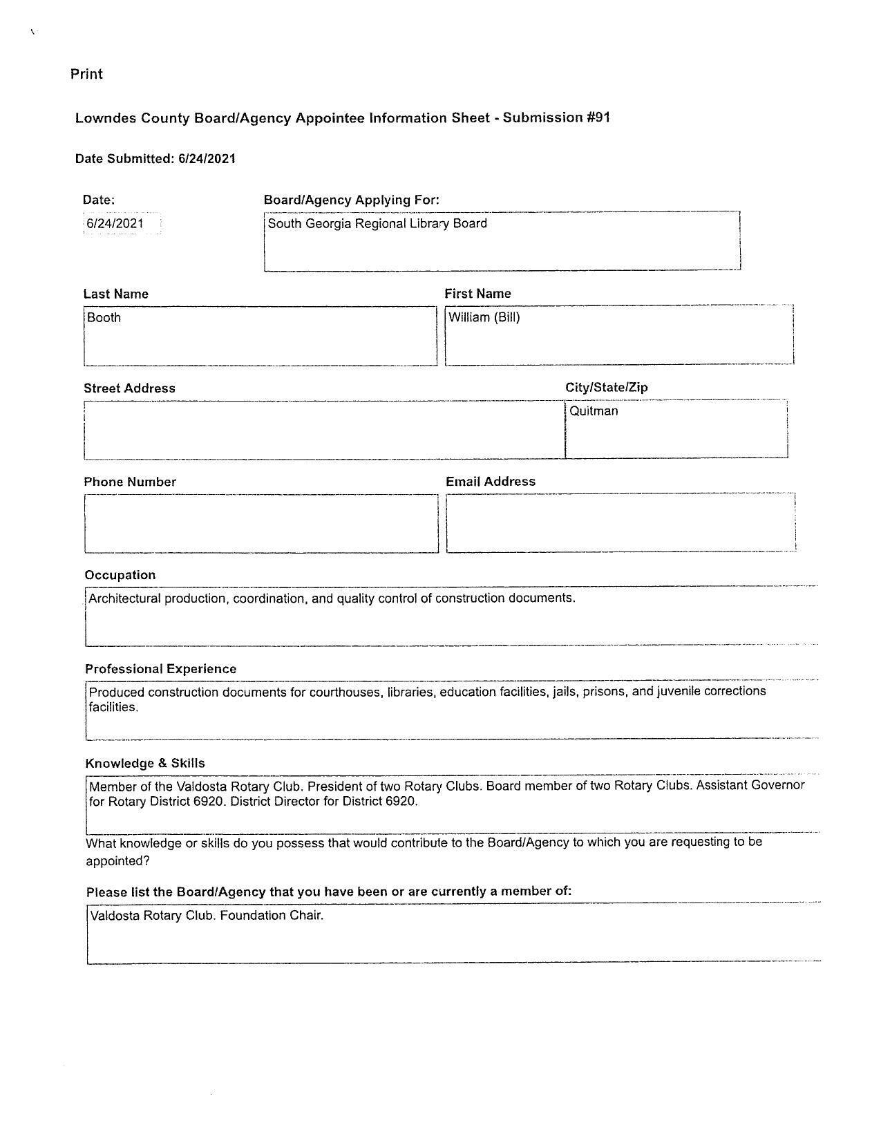 William Booth, Architectural coordination, Quitman, Valdosta Rotary