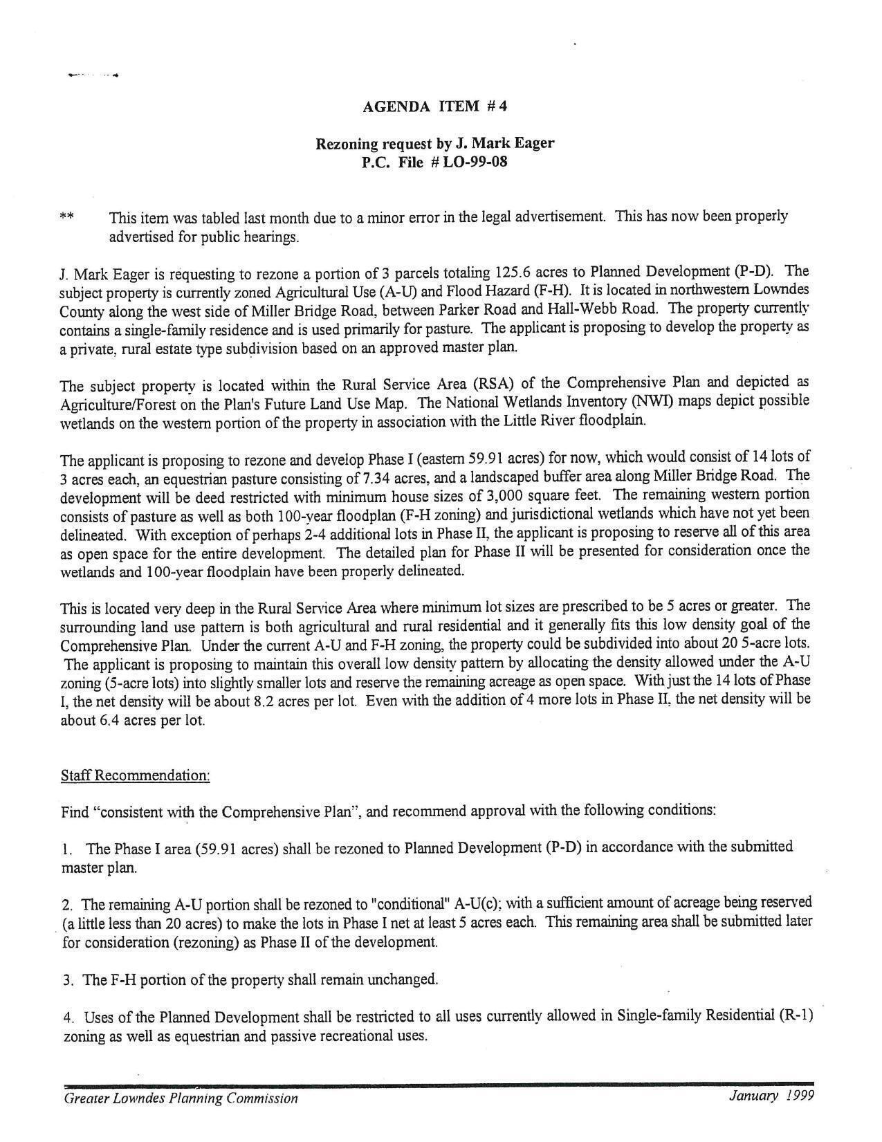 LO-99-08 J. Mark Eager, west side of Miller Bridge Road, 125.6 acres, A-U and F-H to P-D, GLPC Jan 1999REZ-2021-28 Windy Hill S/D, 7532 Miller Bridge Road, ~34 acres, E-A to R-1, Community Well & Septic (WITHDRAWN) | | Six rezonings, Tourism Authority appointment, LMIG, Calendar, ULDC, VOCA, VAWA, Opioid, Land Bank Authority, Fire Dept. @ LCC | | 13 December 2021 |