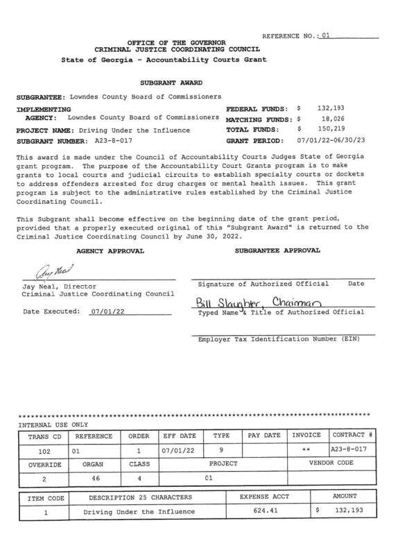 SignatureOffice of the Governor Criminal Justice Coordinating Council Accountability Court Lowndes County DUI Court Grant Award- State Court | | Packet: Construction Board Appointment, Budget, DUI Court, Water, Sewer, Paving, Cyber Security @ LCC | | 27 June 2022 |