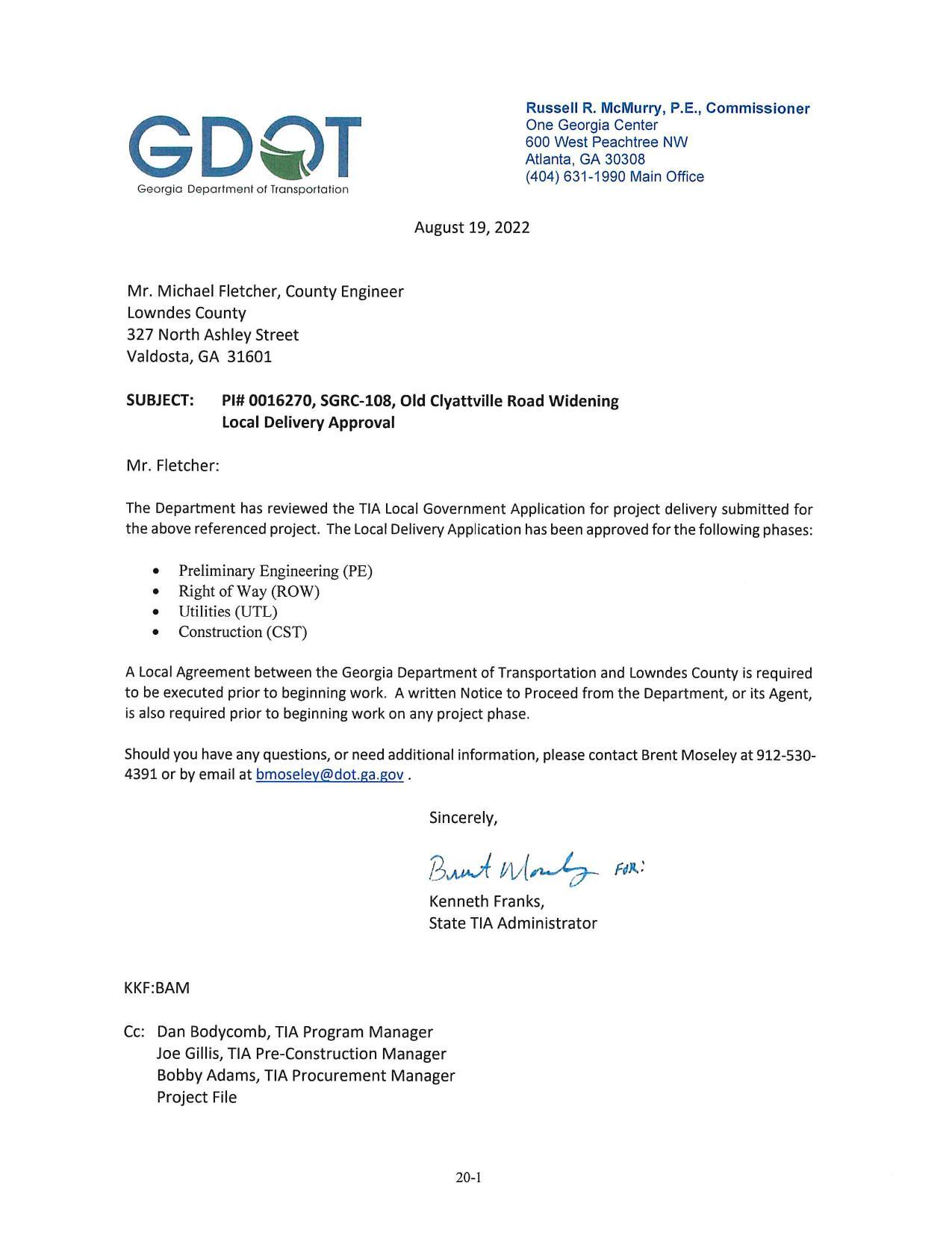 to be executed prior to beginning work. A written Notice to Proceed from the Department, or its Agent,Transportation Investment Act (TIA) Old Clyattville Road Widening Project Agreement | | Sewage LAS expansion testing, Old Clyattville Road widening, Replace county palace chiller @ LCC | | 26 September 2022 |