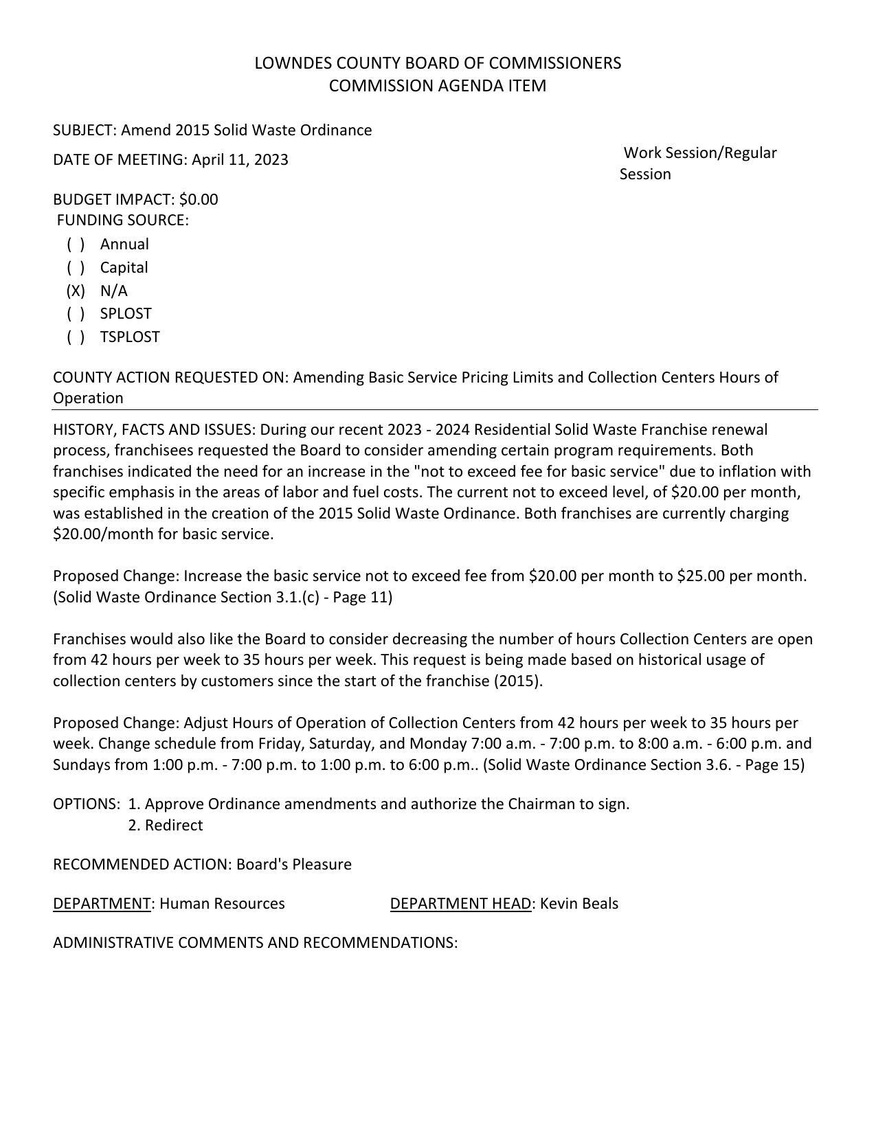 Raise max basic service fee from $20 to $25/month. Reduce Collection Center hours from 42 to 35 hours/week.Amend 2015 Solid Waste Ordinance | | Packet: Raise waste collection rates, appointments to 3 boards, crop sprayer for wastewater hayfield @ LCC | | 10 April 2023 |