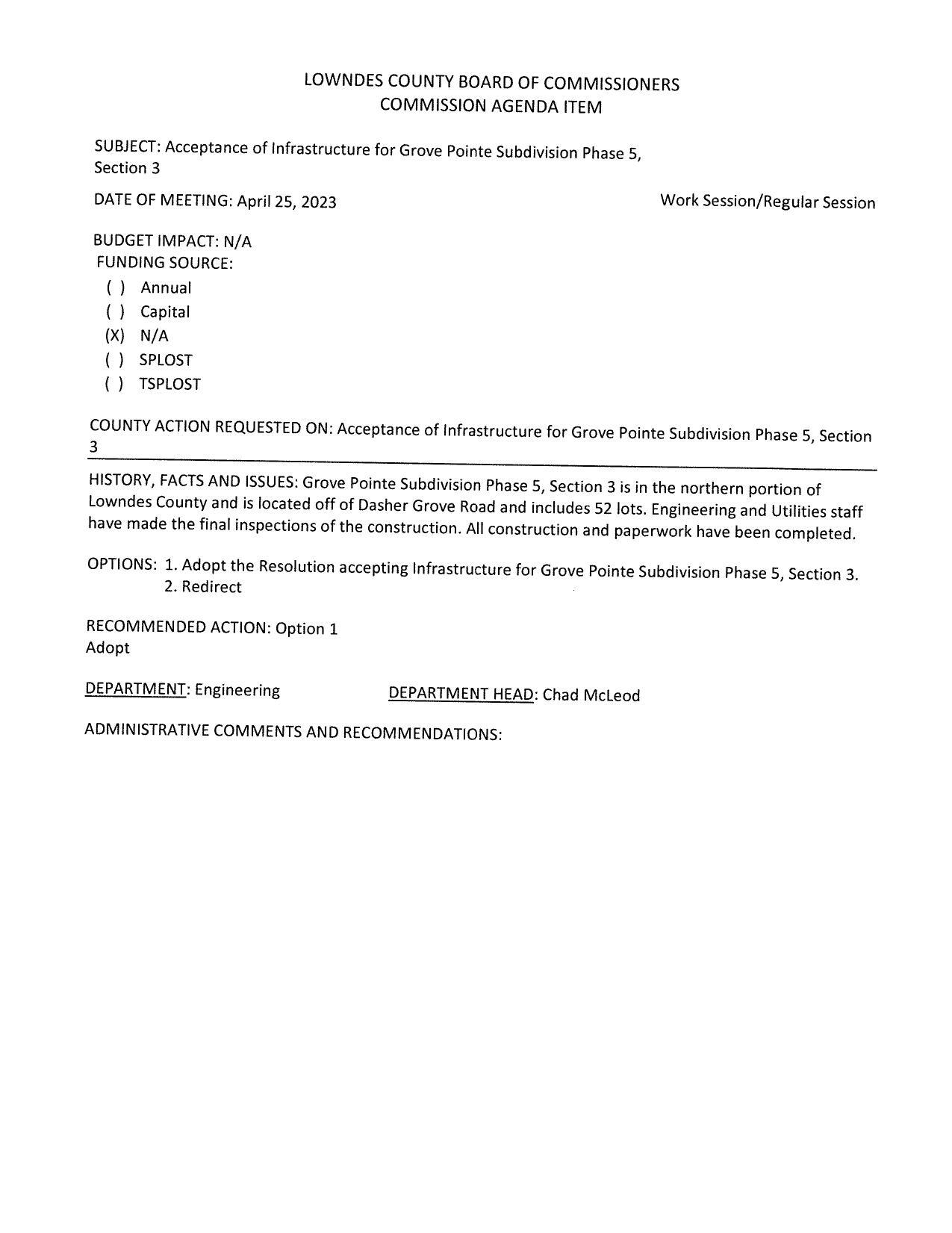 Acceptance of Infrastructure for Grove Pointe Subdivision Phase 5, Section 3
