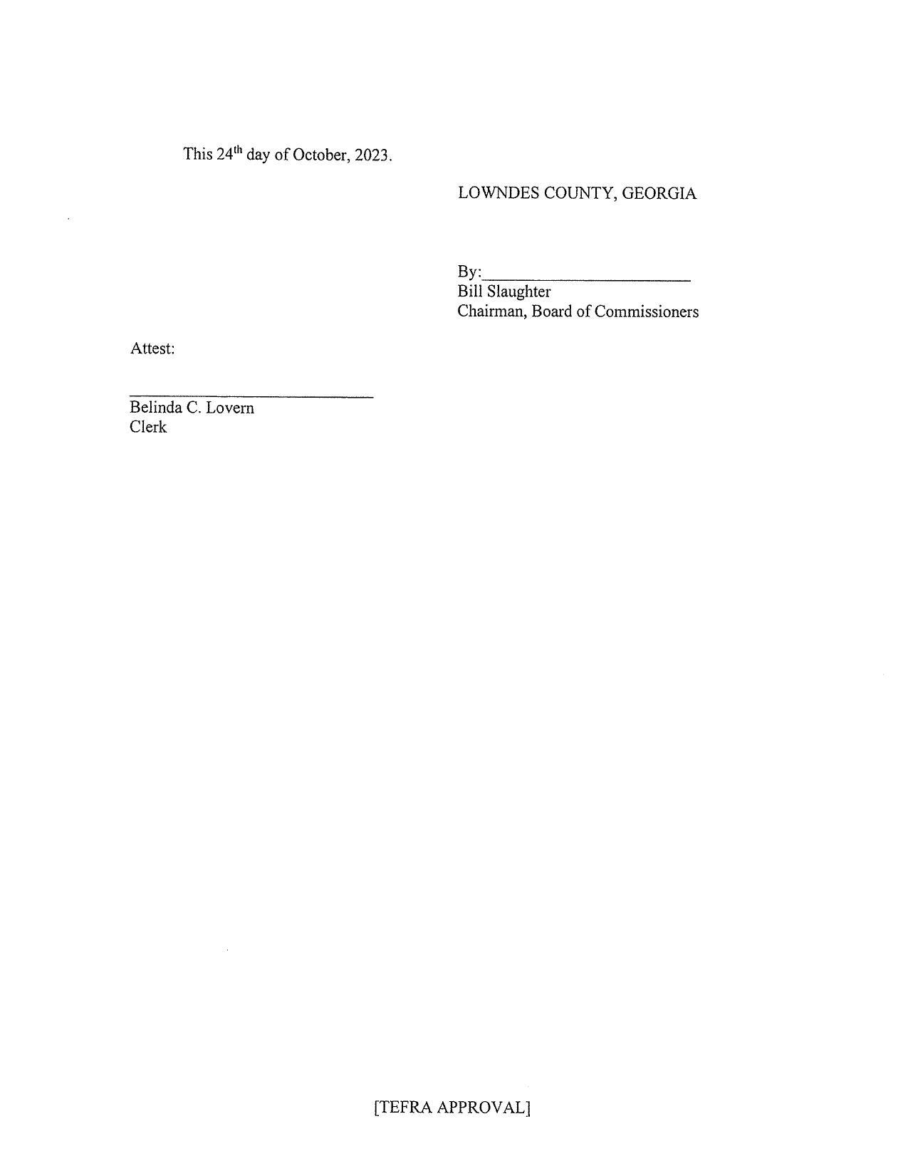 This 24th day of October, 2023.Reissuance of Hospital Authority Refunding Revenue Anticipation Certificates | | ULDC contractor extension, hospital revenue certificate reissuance, LAS generator, Juvenile Justice grant, Val Del Estates infrastructure @ LCC Packet | | 23 October 2023 |