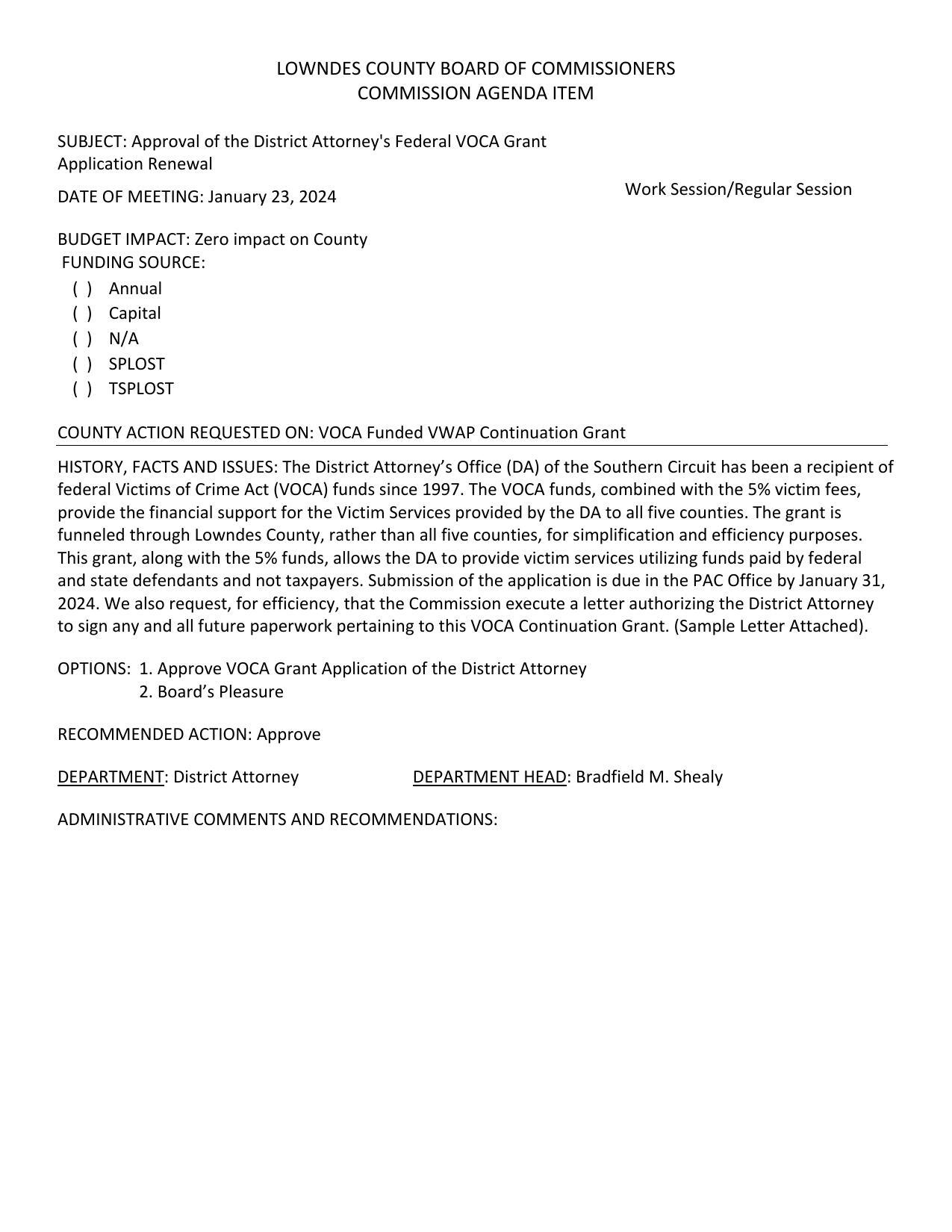 BUDGET IMPACT: Zero impact on County; The VOCA funds, combined with the 5% victim fees, provide the financial support for the Victim Services provided by the DA to all five counties. The grant is funneled through Lowndes County, rather than all five counties, for simplification and efficiency purposes. This grant, along with the 5% funds, allows the DA to provide victim services utilizing funds paid by federal and state defendants and not taxpayers.Approval of the District Attorney's Federal VOCA Grant Application Renewal | | Packet: Appoint another Tax Assessor, Special Assessment Rate, VOCA, federal consultant @ LCC | | 22 January 2024 |