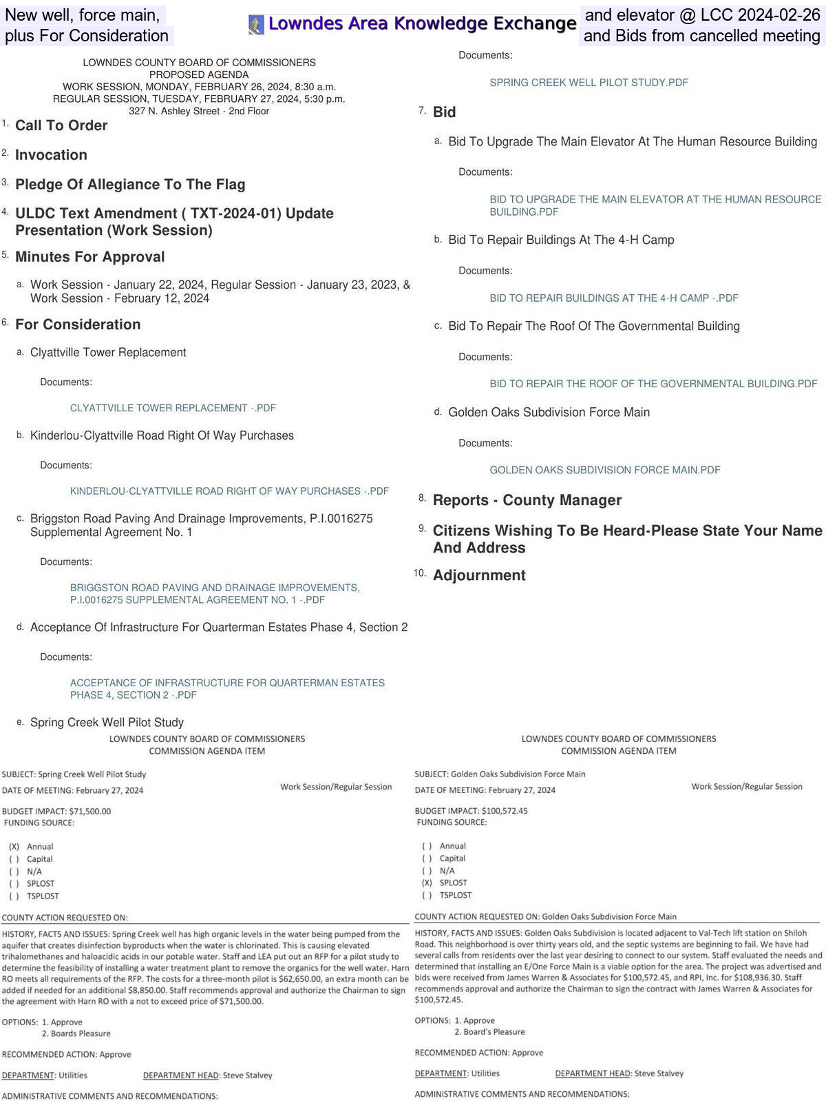 Agenda: ULDC Text Amendment, new well, force main, and elevator plus For Consideration and Bids from previous cancelled session @ LCC